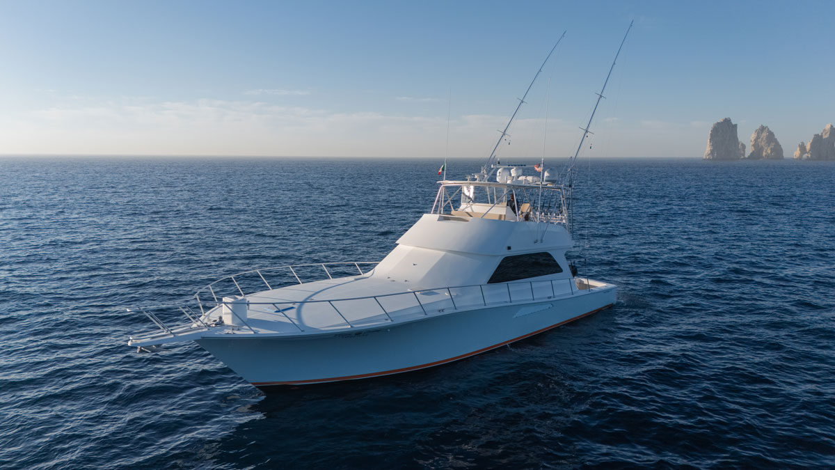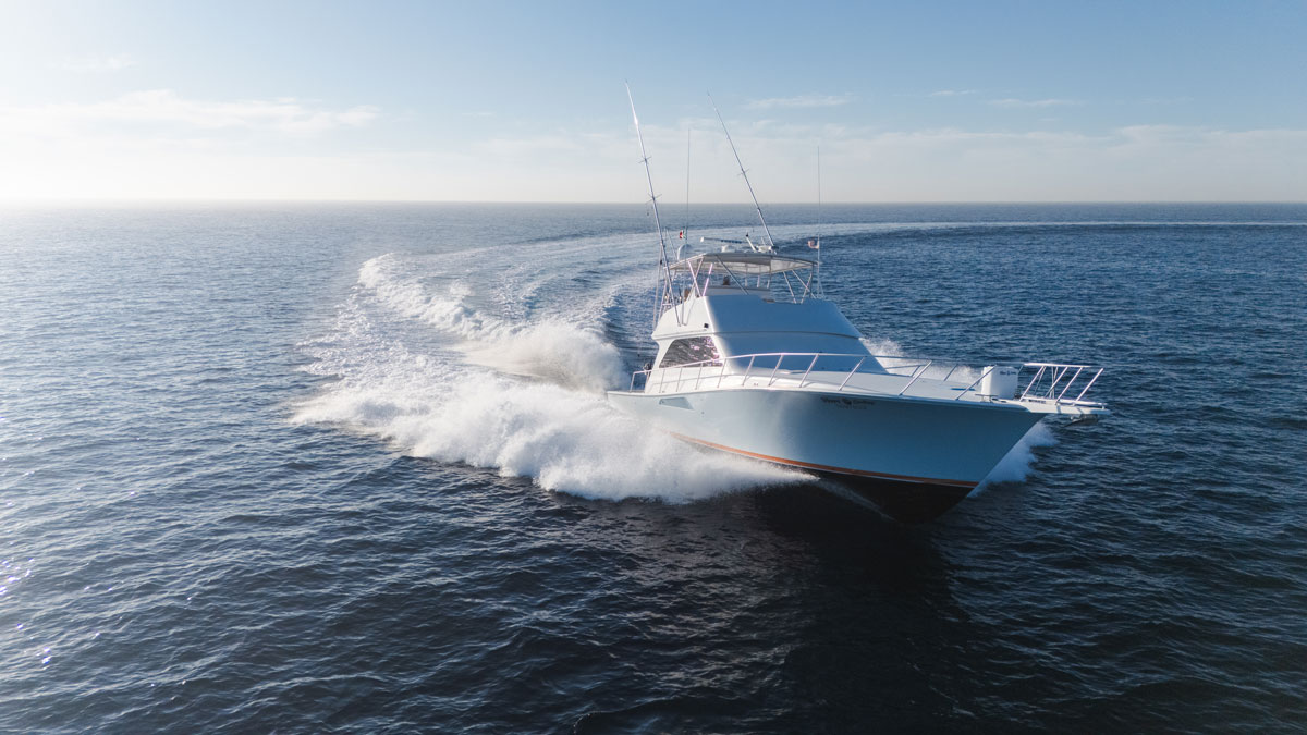 Three stateroom, galley up floorplan, arranged with the master suite amidships, a VIP stateroom forward and two full heads, both with separate stall showers. 200 square foot salon is spacious and includes starboard side peninsula galley and port side dinette. Outside, the large cockpit is fitted with a bait prep station, freezer, baitwells, tuna tubes and access to the engine room, new covering board non-skid, teak on deck, and fighting chair highlight the area. The flybridge is large and well appointed, peninsula console houses new electronics. Seating forward and to port provides guest seating, Seadec flooring compliments the area well and is easy on bare feet.